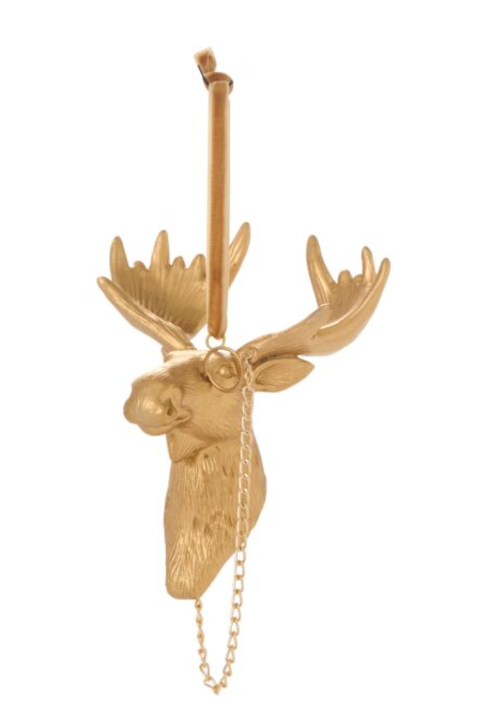 ntroduce whimsical charm to your home with the Eric & Eloise Collection, designed by artist Jessica Heimstra. Crafted from resin poured into hand-carved molds, with a bright gold finish, this delightful series features a bespeckled fox, a mustached hare, a monocled moose, a pipe-smoking buck, and a bowtied mouse. Each ornament includes a gold velvet string and adds a refined and friendly touch to your holiday decor. Explore the full Eric & Eloise family to deck the halls, shelves, & tables with these playful faces.