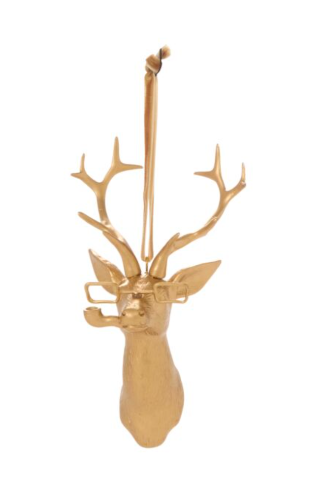 ntroduce whimsical charm to your home with the Eric & Eloise Collection, designed by artist Jessica Heimstra. Crafted from resin poured into hand-carved molds, with a bright gold finish, this delightful series features a bespeckled fox, a mustached hare, a monocled moose, a pipe-smoking buck, and a bowtied mouse. Each ornament includes a gold velvet string and adds a refined and friendly touch to your holiday decor. Explore the full Eric & Eloise family to deck the halls, shelves, & tables with these playful faces.