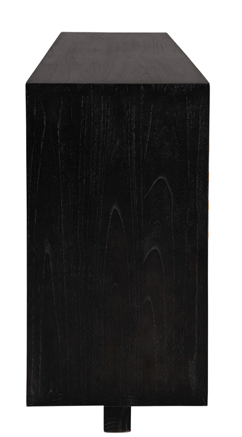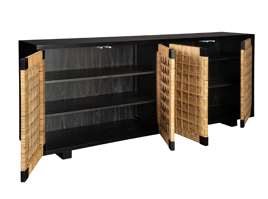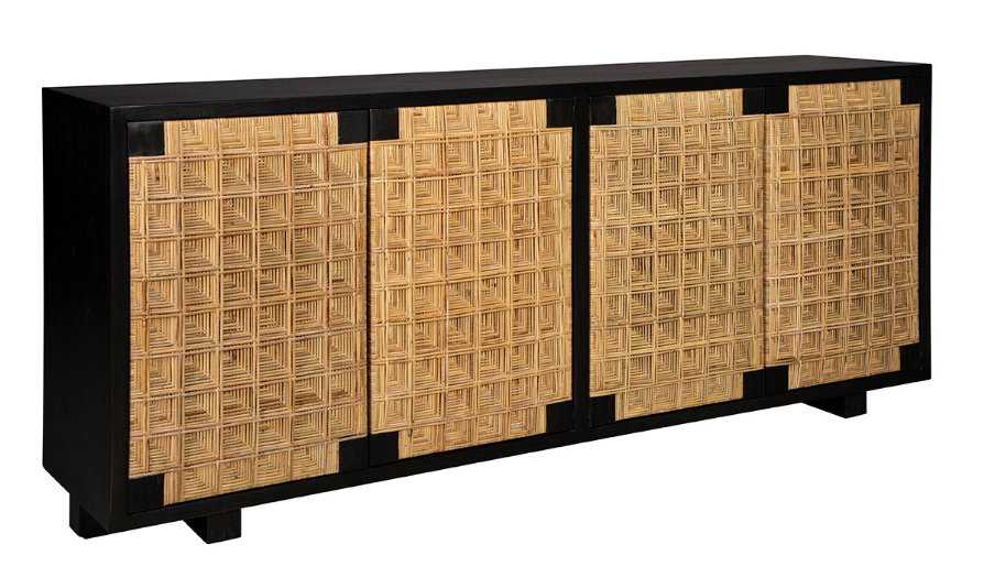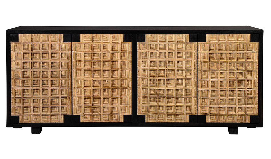 Contrasting natural rattan and sustainably-sourced mahogany elevate your interior décor with this buffet’s natural texture and color, creating a beautiful contrast against the ebony finish. The intricate rattan weave adds texture, warmth, and a touch of tropical elegance, making it a focal point that captivates and delights.