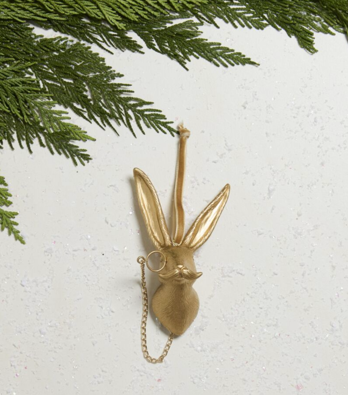 ntroduce whimsical charm to your home with the Eric & Eloise Collection, designed by artist Jessica Heimstra. Crafted from resin poured into hand-carved molds, with a bright gold finish, this delightful series features a bespeckled fox, a mustached hare, a monocled moose, a pipe-smoking buck, and a bowtied mouse. Each ornament includes a gold velvet string and adds a refined and friendly touch to your holiday decor. Explore the full Eric & Eloise family to deck the halls, shelves, & tables with these playful faces.