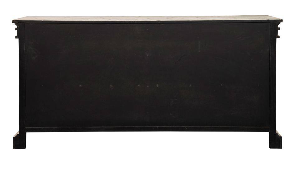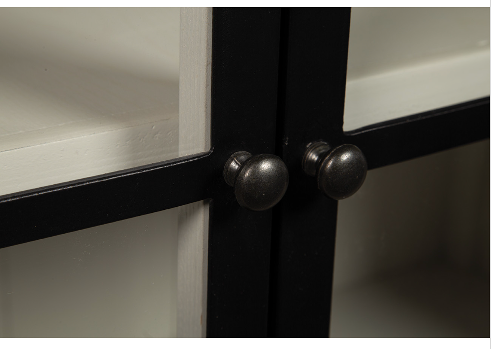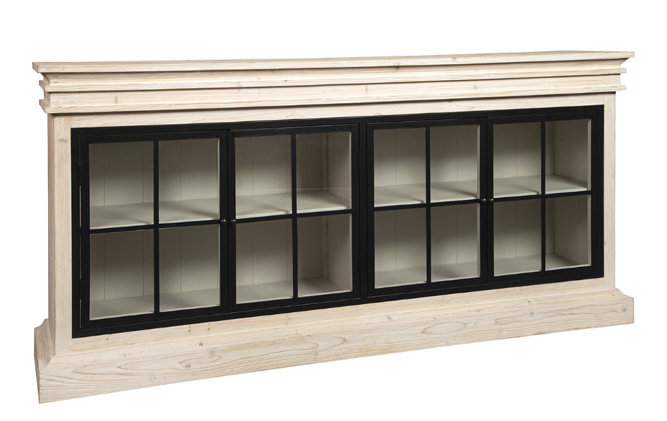 **Opportunity Buy - All Items are sold as is, no returns unless damaged upon receipt. Sporting a slightly exaggerated ogee base and stepped cornice, this arresting pine buffet is made even more eye catching by the contrast of the whitewashed finish and the sleek black metal window pane doors. Behind the doors, there is enough space to display favorite treasures or everyday china. Either way, this buffet is sure to be the star of your room!