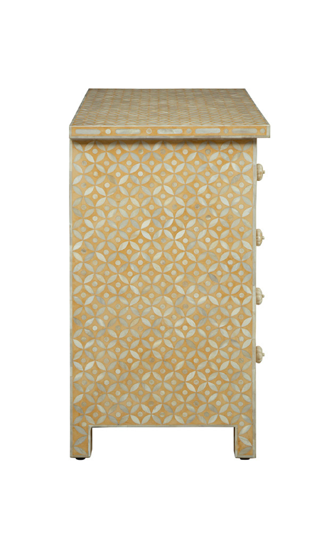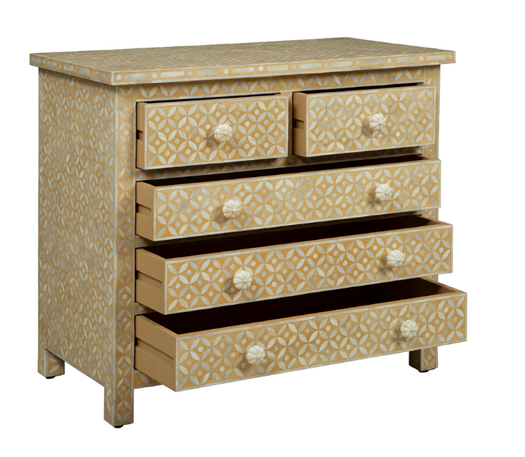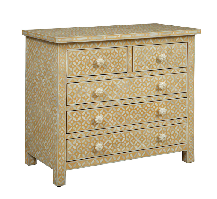 You don’t want to miss our Casava Chest, a captivating furniture piece with a bright yellow base adorned with elegant shell and bone inlay. This ancient decorative technique, tracing back to ancient Egypt, imbues the chest with a luxurious touch that beautifies any space. Boasting five drawers in a compact design, the Casava Chest offers organized storage without compromising on style.
