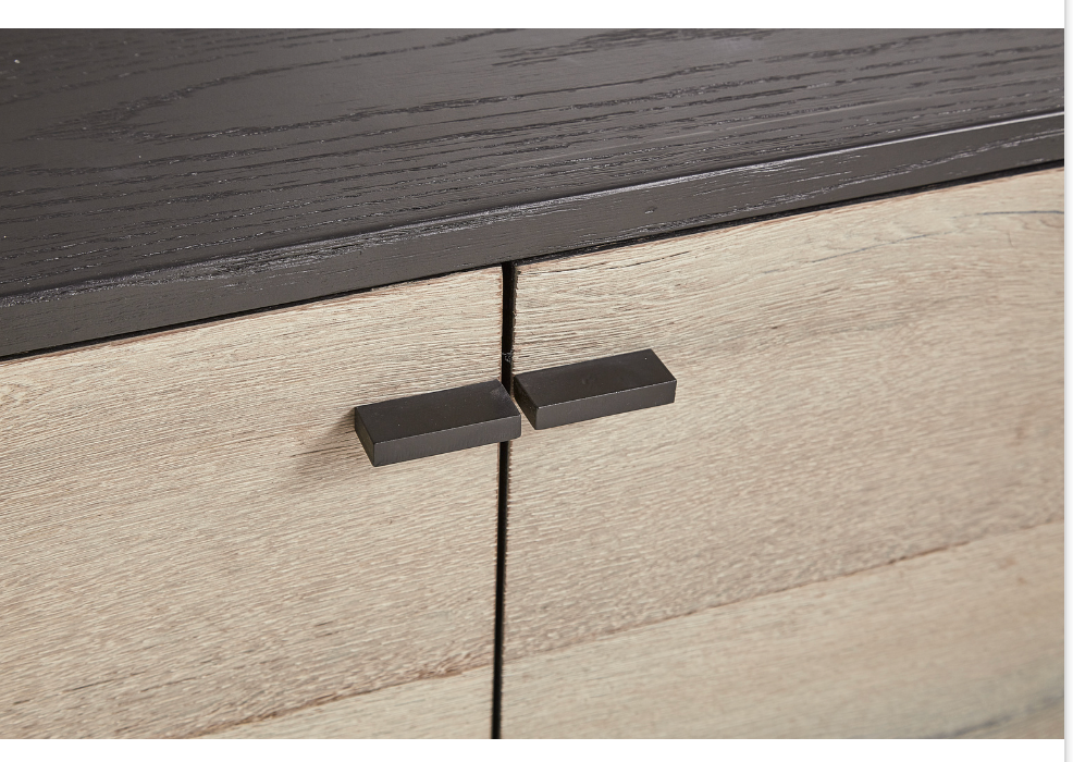 **Opportunity Buy - All Items are sold as is, no returns unless damaged upon receipt. Simple and simply stunning! This oak cabinet is made arresting by contrasting the dark charcoal frame with white washed door fronts, and then adding unexpected iron legs and pulls. The doors open to reveal commodious storage with an adjustable shelf behind each pair. Whether used in a dining room or as the focal point in a great room, this sideboard is certain to steal the show.
