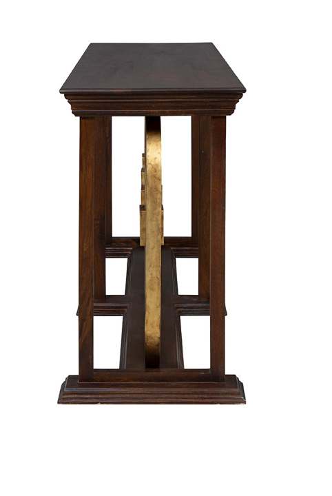Introducing the Everly Console, a harmonious blend of traditional charm and contemporary elegance. The rich brown wood finish exudes a timeless appeal, while the golden ovals intricately bound together in the center add a touch of modern sophistication. Perfect for showcasing your favorite decor items, the Everly Console is a versatile and stylish addition to any space, combining classic warmth with a hint of contemporary flair.