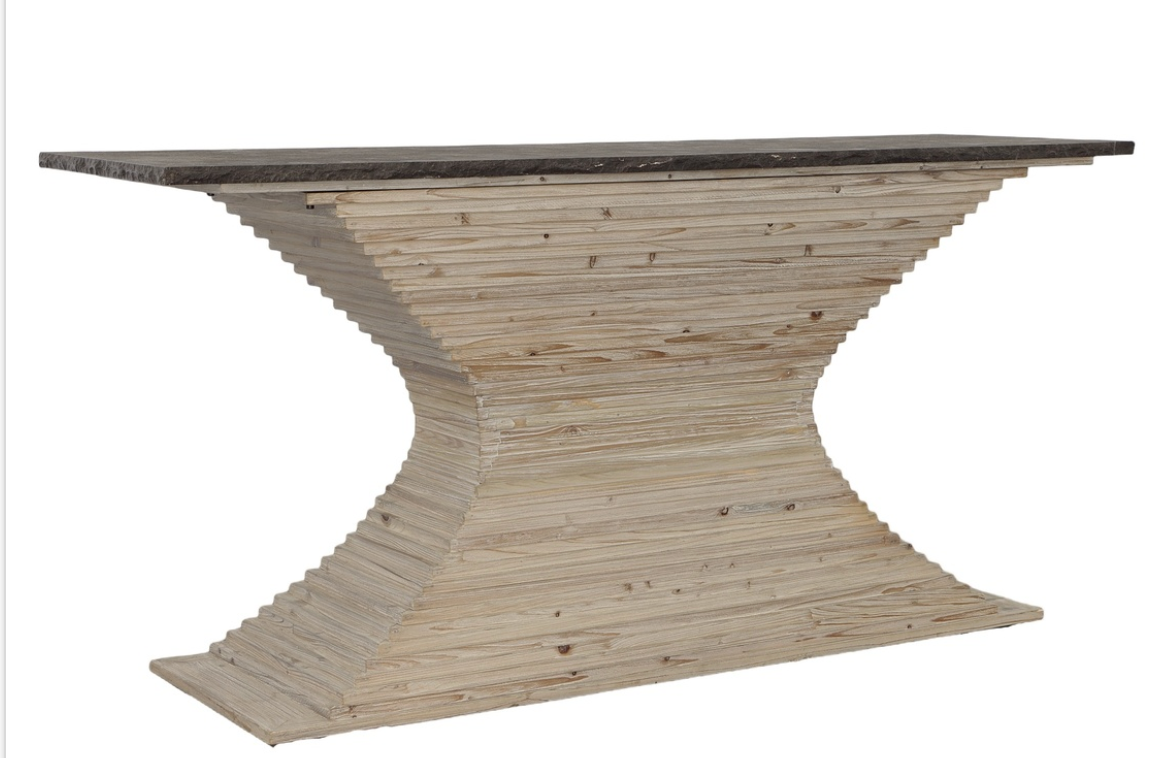 Who knew a pile of pine planks could turn into such an impactful console? The sharply cinched waist design of the base creates a distinctive dynamic when it is topped with a solid slab of fire edged bluestone. Scaled to impress, this console is sure to become a favored accent in your home.