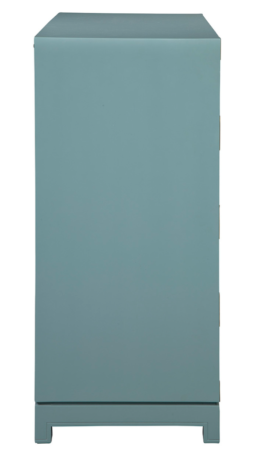 Crafted from solid mahogany, known for its durability and timeless appeal, this chest offers both style and functionality with the addition of soft-close drawers. The smooth, satin finish enhances the natural grain of the wood while showcasing a palette inspired by the mesmerizing shades of the sea— from tranquil blues and soothing