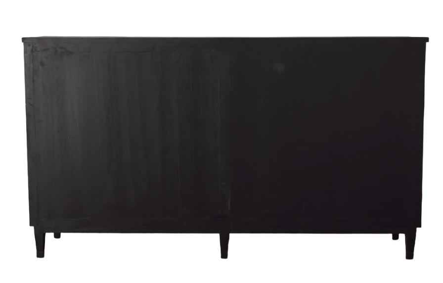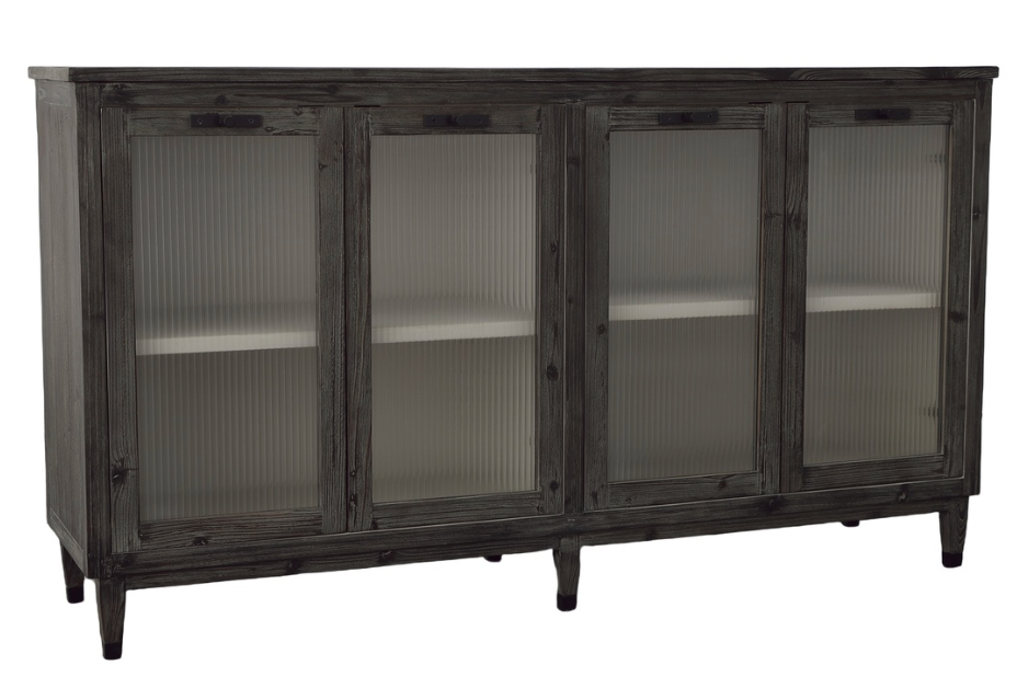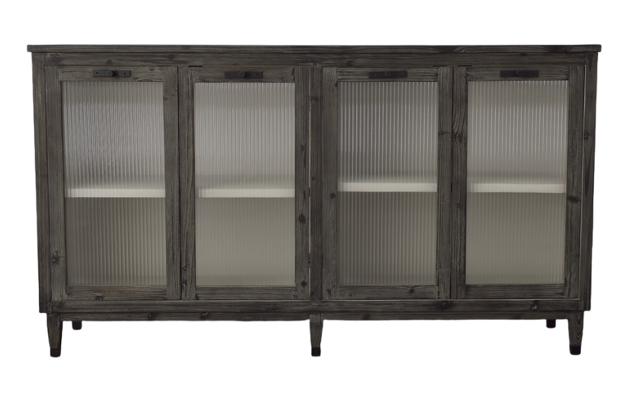 **Opportunity Buy - All Items are sold as is, no returns unless damaged upon receipt. Recalling old time pharmacy cabinets, but chic enough for any modern home, this stately server is constructed of solid pine. A translucent charcoal finish allows the natural beauty of the wood to shine through, while the reeded glass door panels soften the view of what is stored within the contrasting light interior. Cleverly mounted at the top of each drawer, the black pulls add an additional contemporary touch.