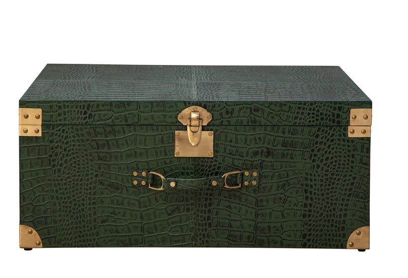 The Marvin's Large Trunk is a statement piece that blends antique appeal with modern sophistication. Covered in faux green crocodile leather, this dark forest green trunk features luxurious gold accents for a touch of elegance. Versatile in use, it can serve as a small coffee table, an eye-catching accent piece, or a stylish storage solution for your treasured memories. Unique and bold, this trunk is sure to stand out in any room.
