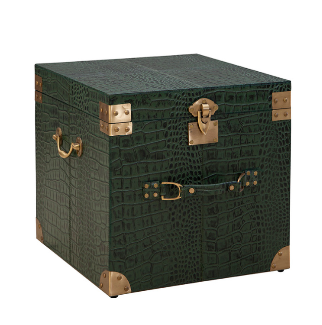 Marvin's Small Trunk is a statement piece that seamlessly blends antique charm with modern sophistication. Wrapped in faux green crocodile leather in a rich dark forest green, it features luxurious gold accents that add a touch of elegance. Versatile and stylish, this trunk can be used as a distinctive accent piece or a chic storage solution for treasured memories. Bold and unique, it’s designed to stand out in any room.