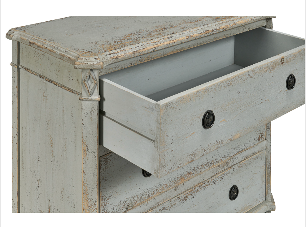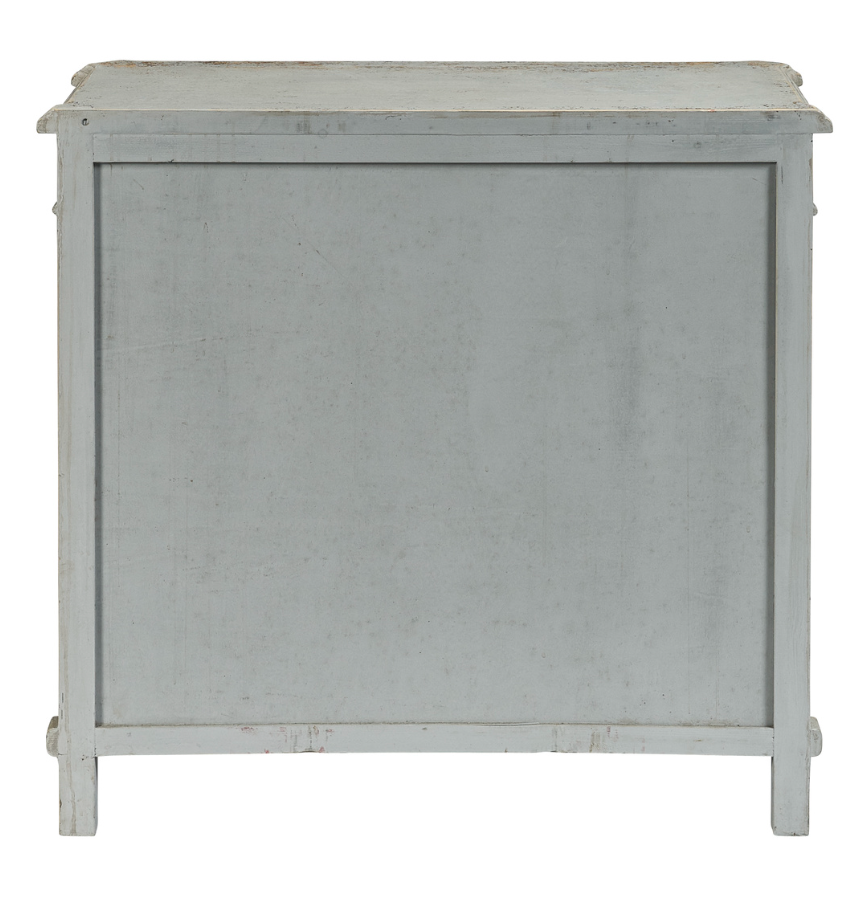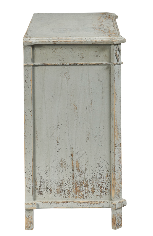 Generously scaled to hold linens, games or beach towels, this handsome chest is crafted from reclaimed pine with an authentically distressed soft gray blue paint. Angled corners lighten the profile, and diamond shaped moldings add a touch of visual interest.