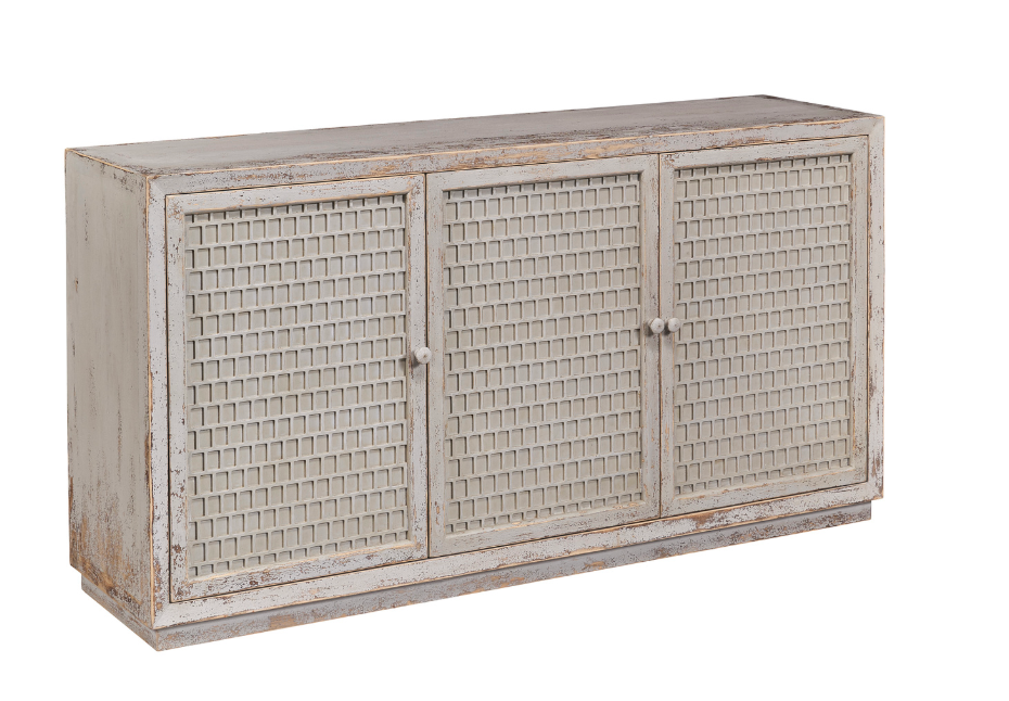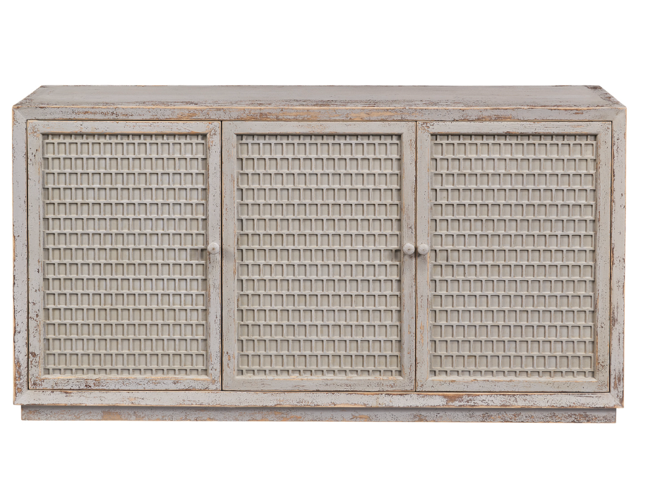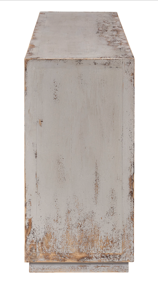 Crafted of reclaimed pine, and hand painted with a lightly distressed grey finish, this handsome sideboard features uniquely detailed doors. The arresting carved panels catch light and create a play of shadows on the framed doors, making this a quietly impactful addition to your home.