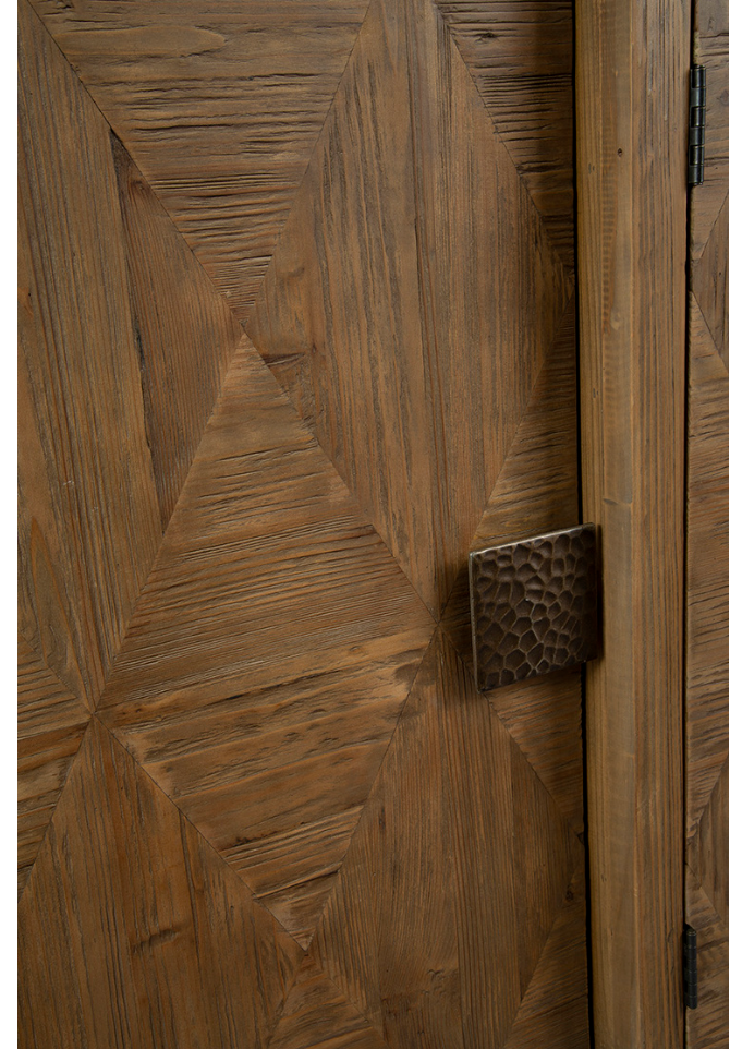 Th e geometric design element adds depth, visual interest, and a touch of modern sophistication, creating a focal point that enhances the buffet’s overall aesthetic to this solid and sturdy reclaimed pine buffet. Hammered brass pulls finish off the unique look.