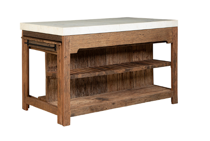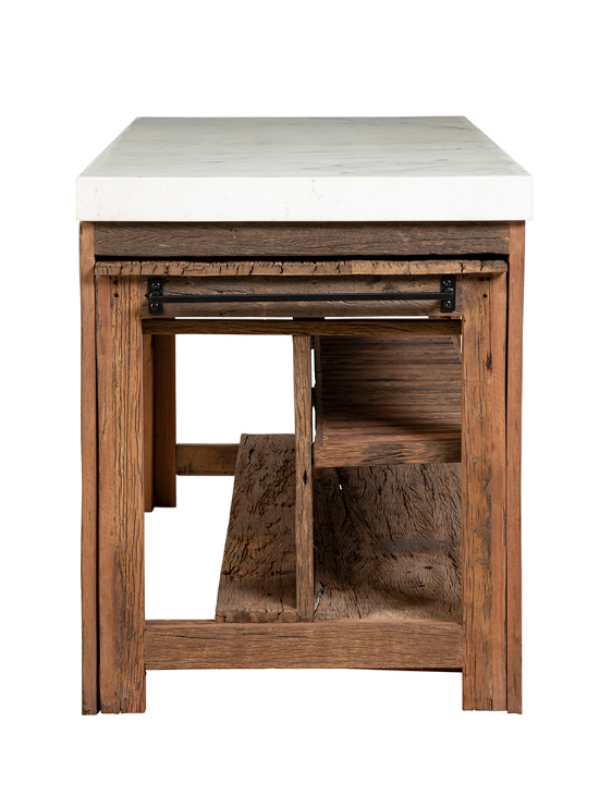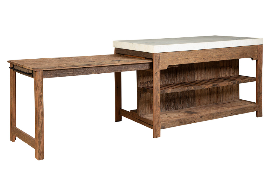 Introducing the Rustic Marble Island, a truly unique piece crafted from reclaimed wood and topped with a luxurious marble counter. This island features a special pull-out table that can comfortably seat two to four people, along with space for two stools on one side of the marble counter. On the other side, a convenient shelf provides the perfect spot for storing wine or kitchen essentials. Combining functionality and beauty seamlessly, the Rustic Marble Island is a standout addition to any kitchen, offering both practicality and aesthetic charm in one exquisite piece.