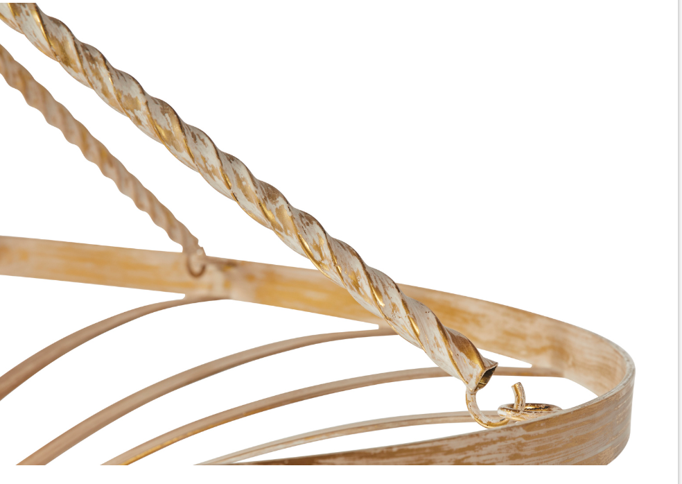 The gleaming golden metal elements of this unique chandelier are washed with a soft cream glaze. The chains are twisted to create a play of light which is further enhanced by the use of a cast rock crystal drop. Geometric interest is provided by the concave arched arms of this deceptively simple chandelier.